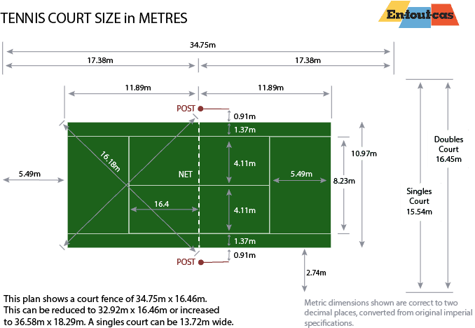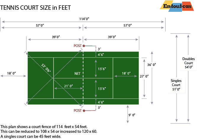 The original dimensions were laid down in feet, but our plans show imperial and metric dimensions. In broad terms, the tennis court enclosed by a fence will occupy a space somewhere between 120 feet by 60 feet and 108 feet by 52 feet. A singles-only court can be accommodated in a space 45 feet wide.
